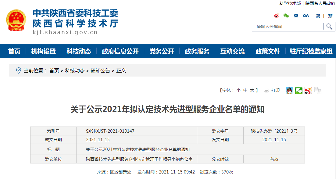 根据《陕西省技术先进型服务企业认定管理办法(试行)》(陕科产发﹝2017﹞220号)、、、《关于在〈陕西省技术先进型服务企业认定管理办法(试行)〉中增补〈技术先进型服务业务领域范围(服务贸易类)〉的通知》(陕科办发﹝2018﹞118号)精神,,,经企业申报、、地市审查推荐,,,省科技厅会同省财政厅、、、、省税务局、、、、省商务厅、、、、省发展改革委组织专家评审,,,现对拟认定技术先进型服务企业名单(详见附件)进行公示,,,,公示期为10个工作日。。。