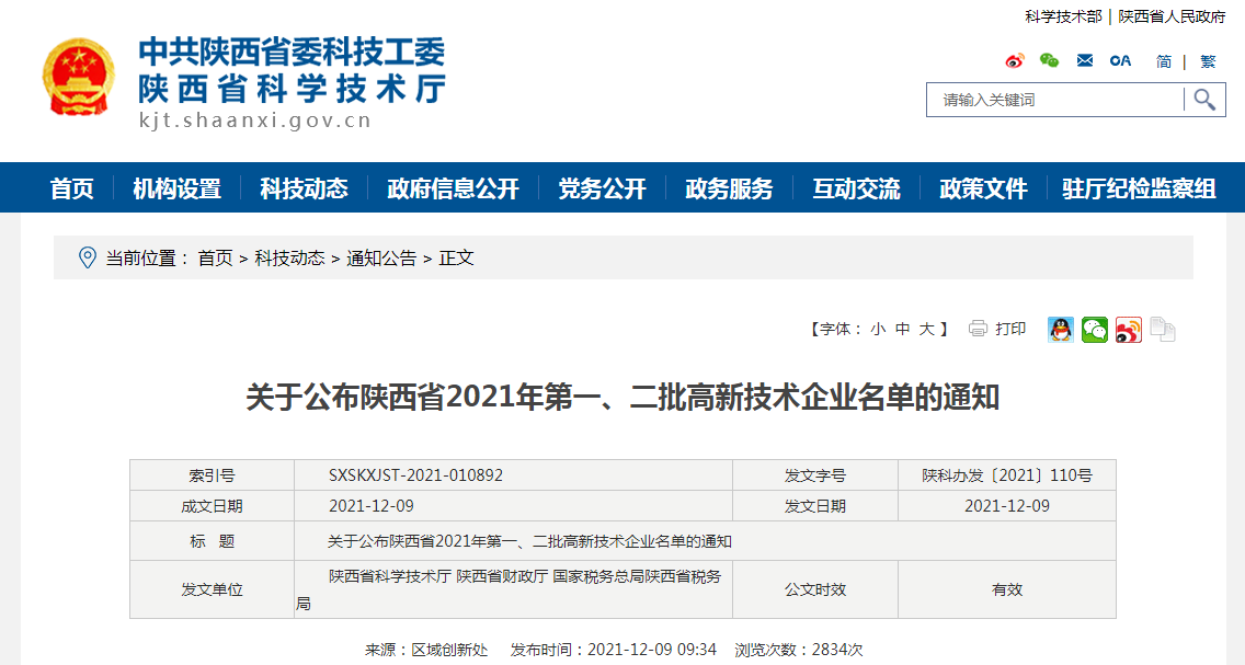 关于公布陕西省2021年第一、、、二批高新技术企业名单的通知
