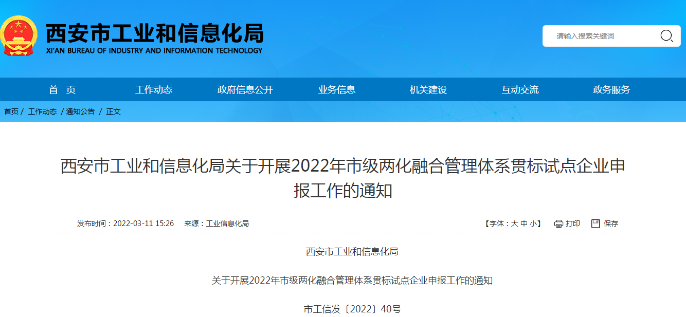 西安市工业和信息化局关于开展2022年市级两化融合管理体系贯标试点企业申报工作的通知